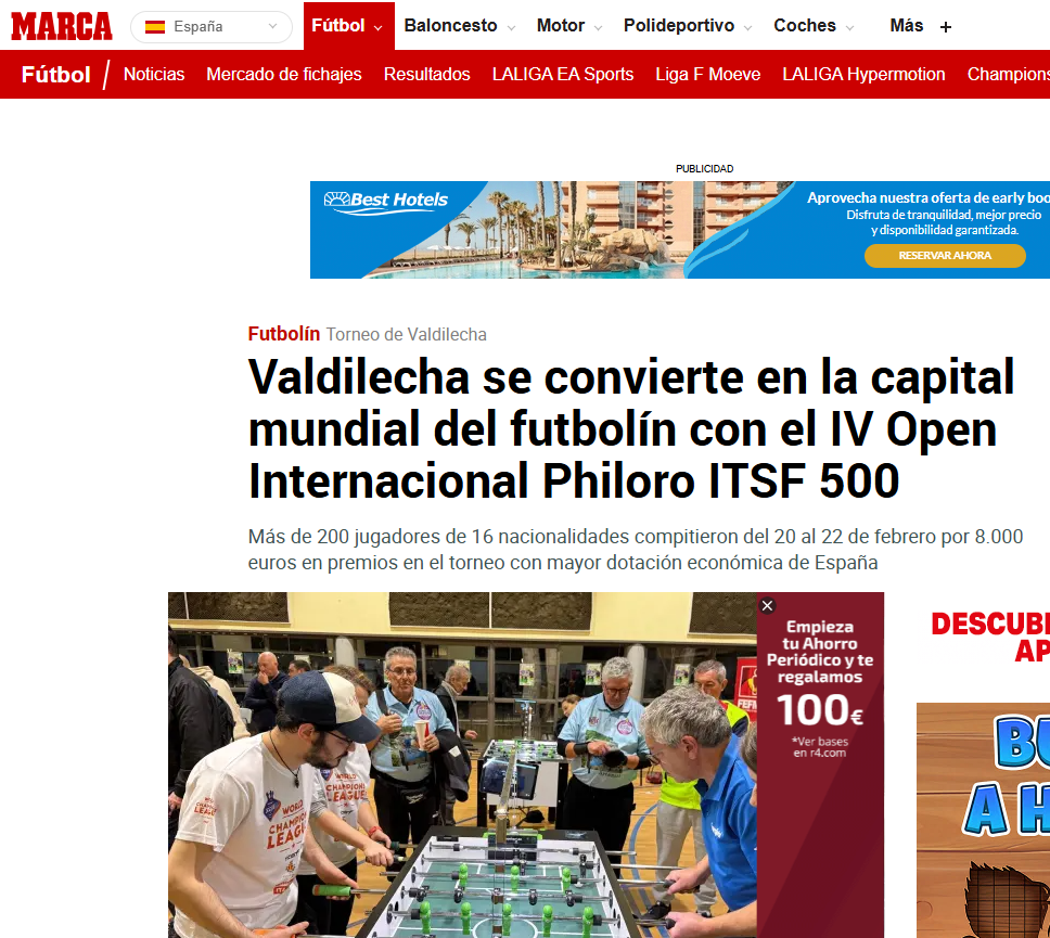 El IV Open Internacional Philoro ITSF 500 de Valdilecha ha dado un paso definitivo en su consolidación como uno de los grandes eventos del calendario internacional de futbolín. La repercusión mediática alcanzada este año ha sido histórica, con cobertura en el diario deportivo líder en España, Marca.